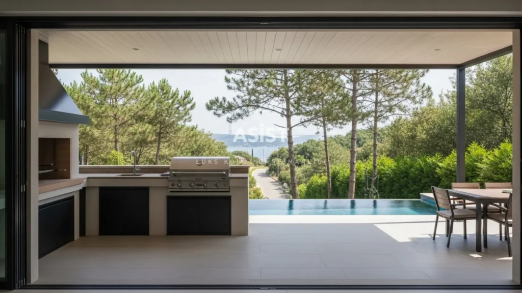 Barbekü alanları, dumanın evin içine girmesini engelleyecek rüzgar yönü hesaplamaları yapılarak bahçenin en uygun köşesine yerleştirilmiştir. Özel tasarlanmış kış bahçesi bölümleri, serin sonbahar akşamlarında dahi bahçe keyfinden mahrum kalmamanızı sağlar.